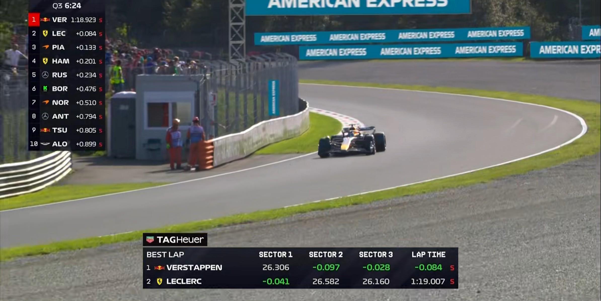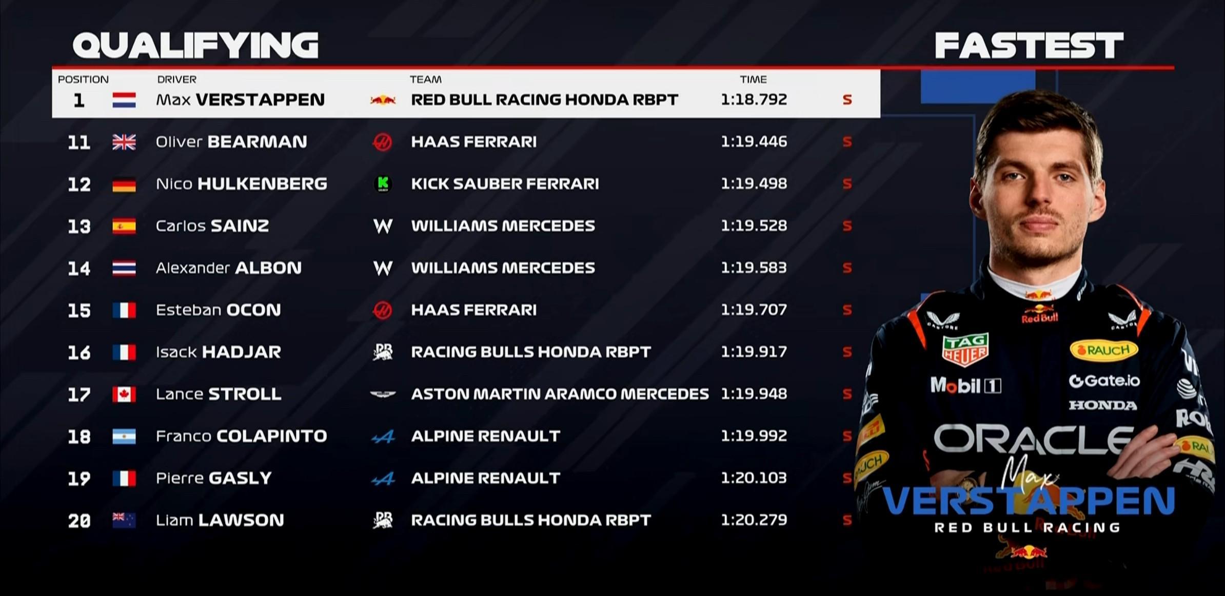 Q3首轮飞驰圈结束,维斯塔潘第三段刷紫来到榜首,他也是本周末首个进入1分19秒大关的车手!